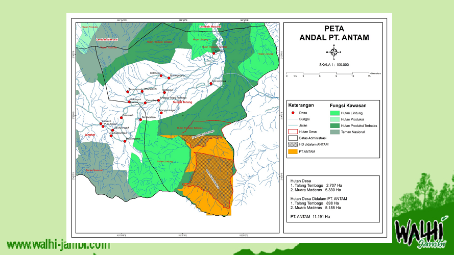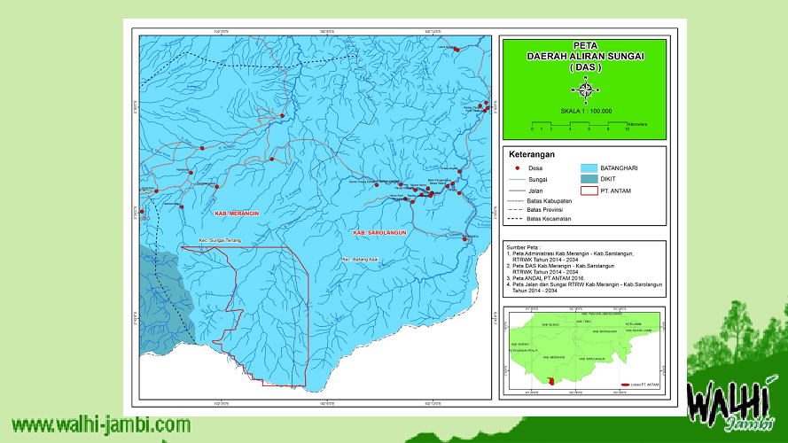 Padahal dari hasil analisis overlay yang dilakukan oleh Walhi Jambi, perkantoran terletak di kabupaten Merangin, namun seluruh aktivitas baik dengan cara membuka tutupan hutan yang masih baik maupun aktivitas kegiatan PT. ANTAM mengakibatkan sungai-sungai besar di Kabupaten Sarolangun.