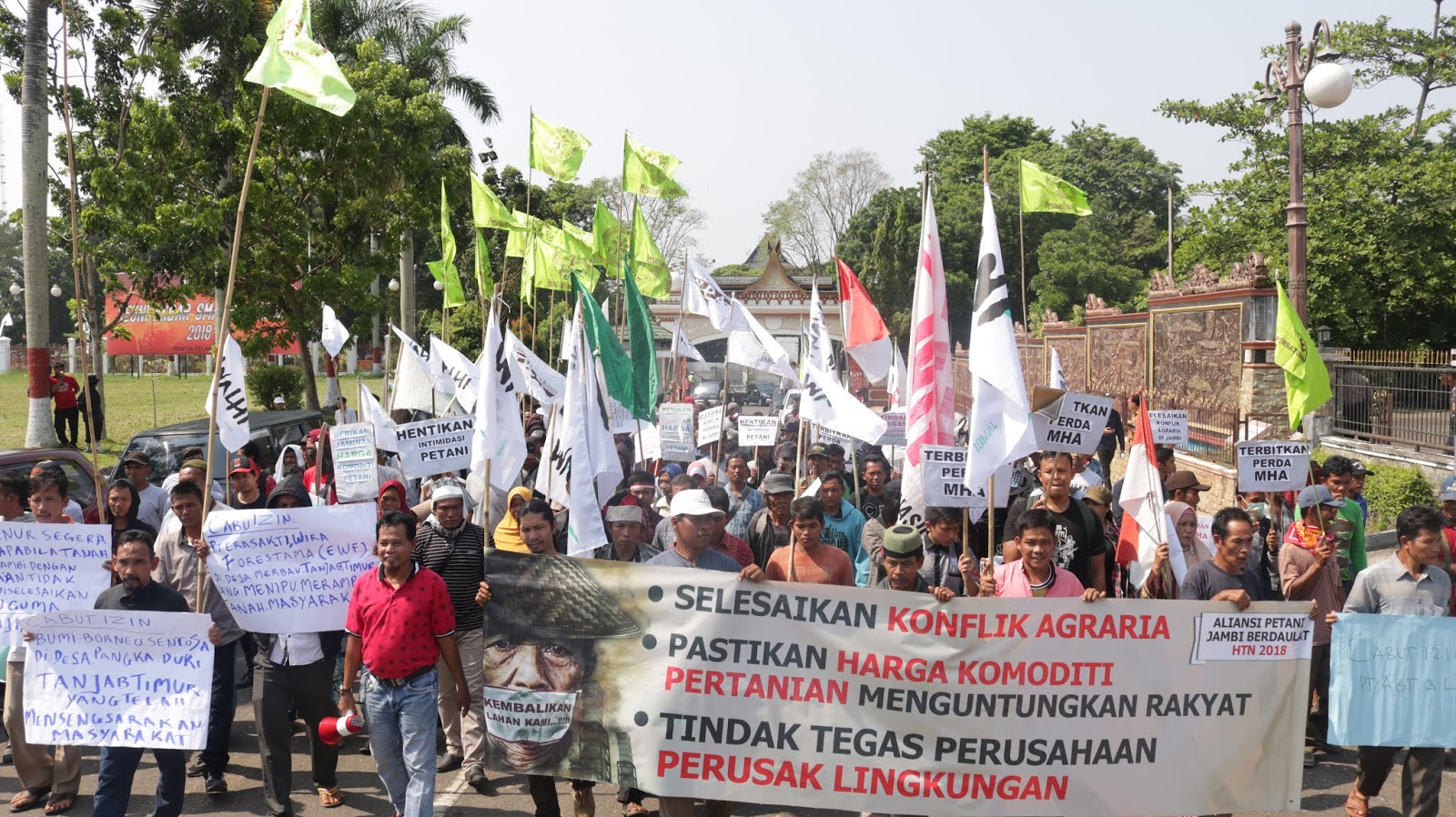 Jambi – Memperingati Hari Tani Nasional (HTN) 2018, WALHI Jambi dan beberapa lembaga jaringan yang ada di Jambi, seperti ormas mahasiswa, kelompok seni, dan para petani dari 30 desa di 5 kabupaten, yakni Tebo, Batanghari, Muarojambi, Tanjungjabung Timur, dan Tanjungjabung Barat, Provinsi Jambi, tergabung dalam “Aliansi Petani Jambi Berdaulat”, melakukan aksi damai di Kantor DPRD Provinsi Jambi, Telanaipura, Kota Jambi, Senin (24/9/2018).