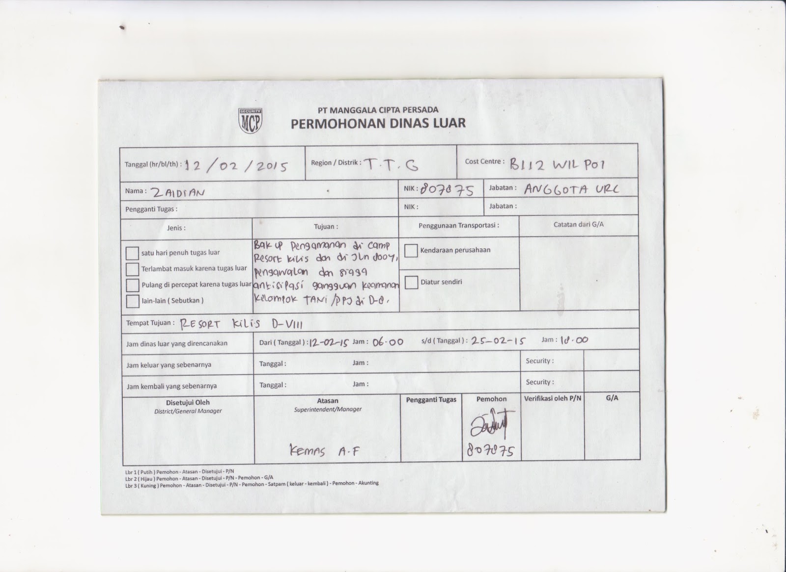 | Salah satu form Back Up yang menyebutkan back up bertujuan untuk antisipasi gangguan kelompok Tani,Bukan padatnya aktivitas |